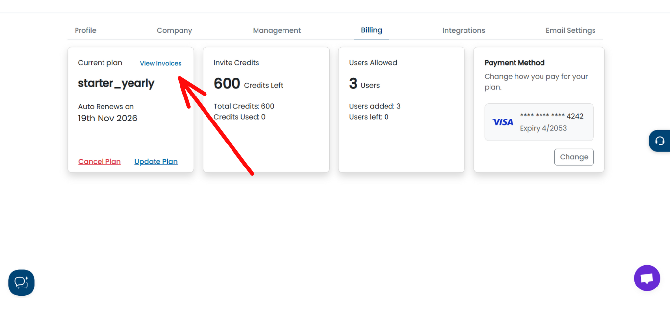 - Click the View Invoices button present on current plan card