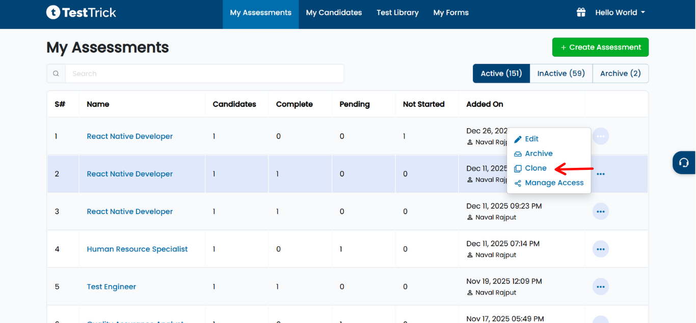 TestTrick allows you to clone any assessment, whether it is active or inactive, to save time when creating similar evaluations. Cloning duplicates all tests, questions, and configurations from the original assessment.
