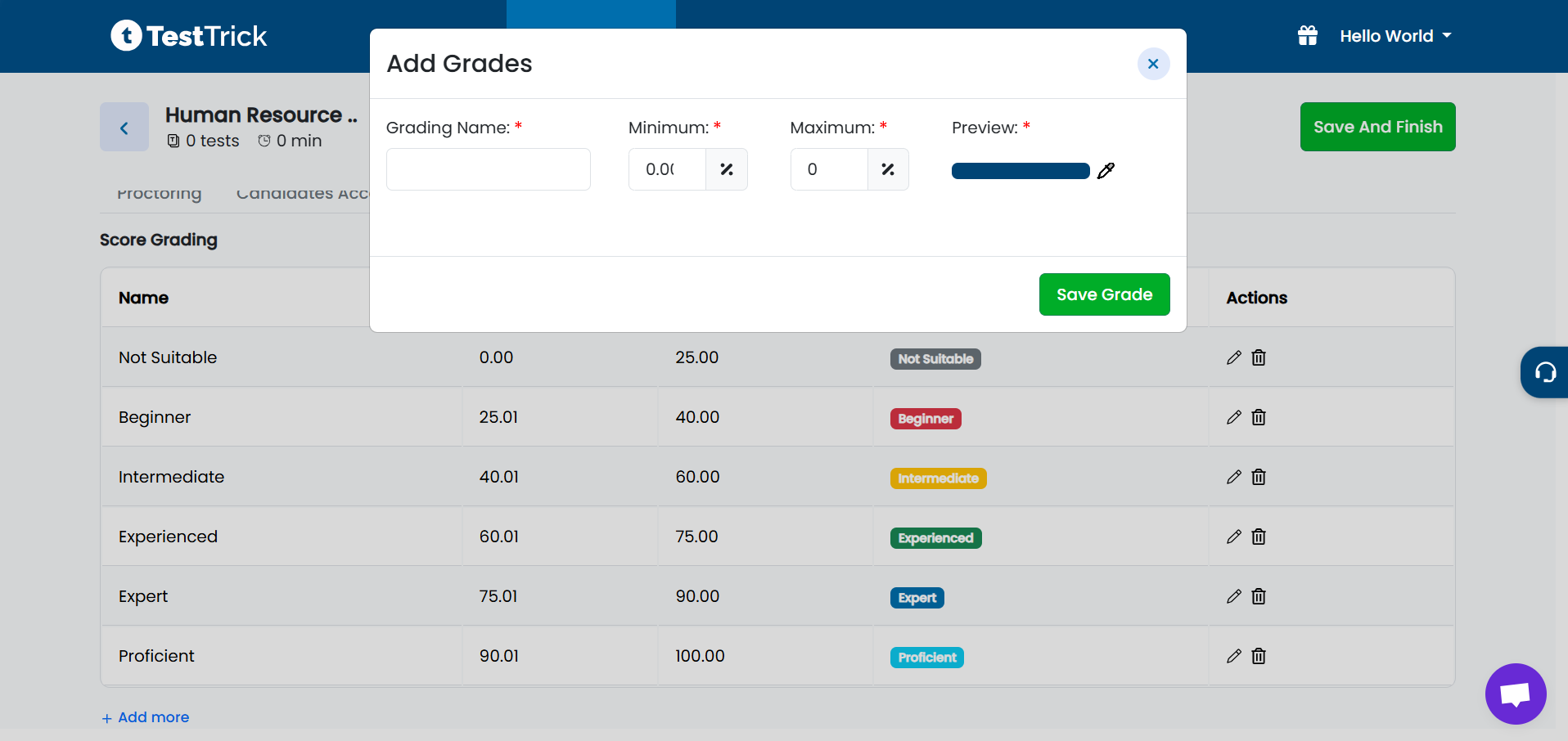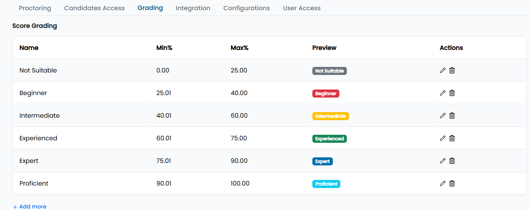 The Grading feature in TestTrick allows you to define score ranges and assign meaningful labels to candidate performance. This helps you quickly interpret results and evaluate candidates based on predefined criteria.