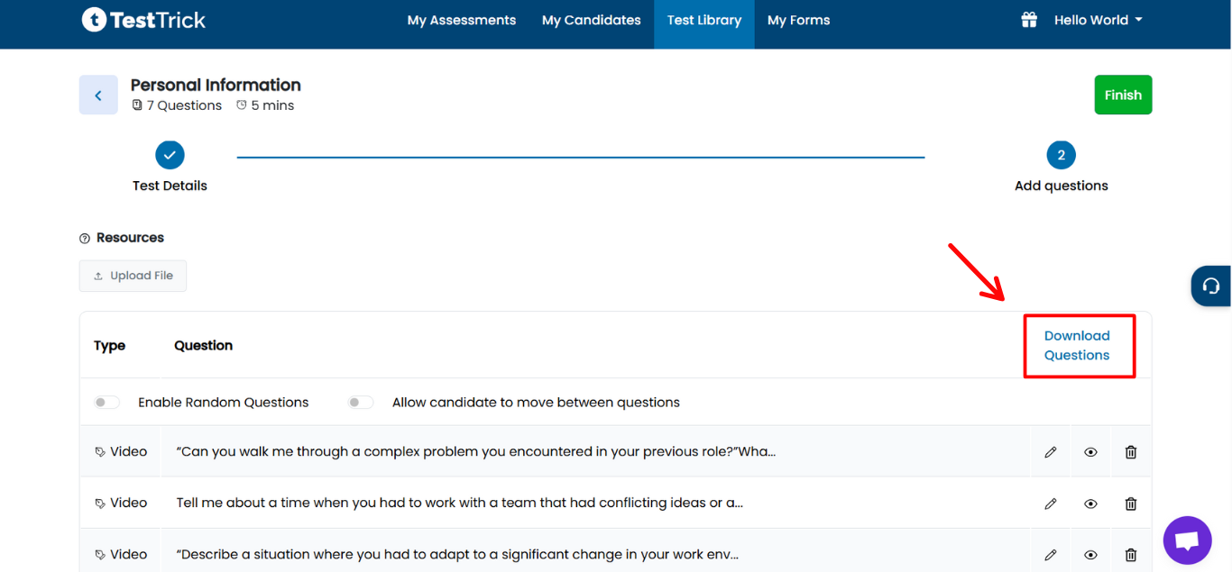 TestTrick allows you to download all questions added to a test for offline review or record-keeping. This feature is available during Step 2 (Add Questions) of test creation or editing.