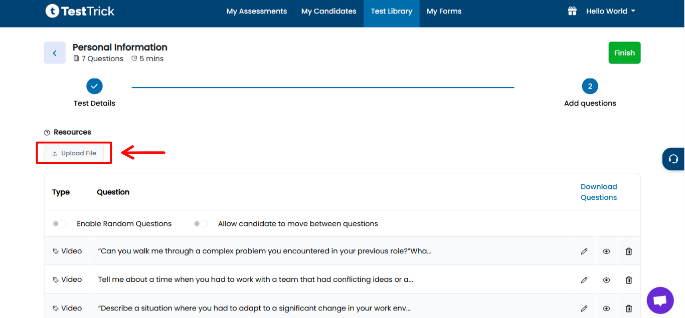 Resources allow you to share supporting materials with candidates during a test. These materials help provide context, reference information, or data required to answer questions accurately.