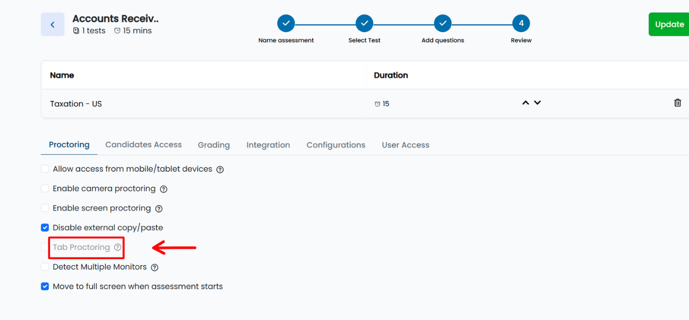 If an assessment contains any test with resources, certain proctoring settings are adjusted automatically.