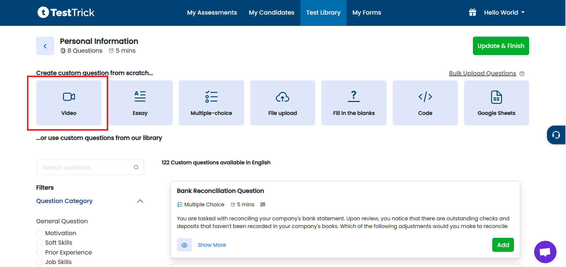 TestTrick allows you to add video questions to your tests, enabling candidates to record their response in video format. Video questions are ideal for assessing communication skills, presentation ability, or role-specific tasks, and are especially useful for one-way interviews.