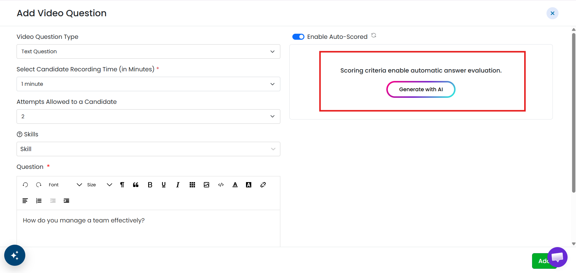 AI automatically generates scoring criteria based on the question. You can review and edit the criteria if needed. Once enabled, AI will evaluate candidate video responses using these criteria and score it according to the question.