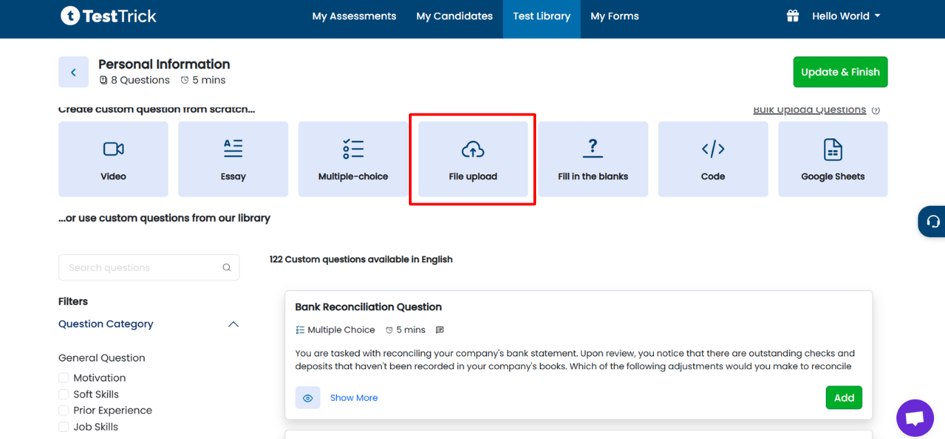 File Upload Questions in TestTrick allow you to: