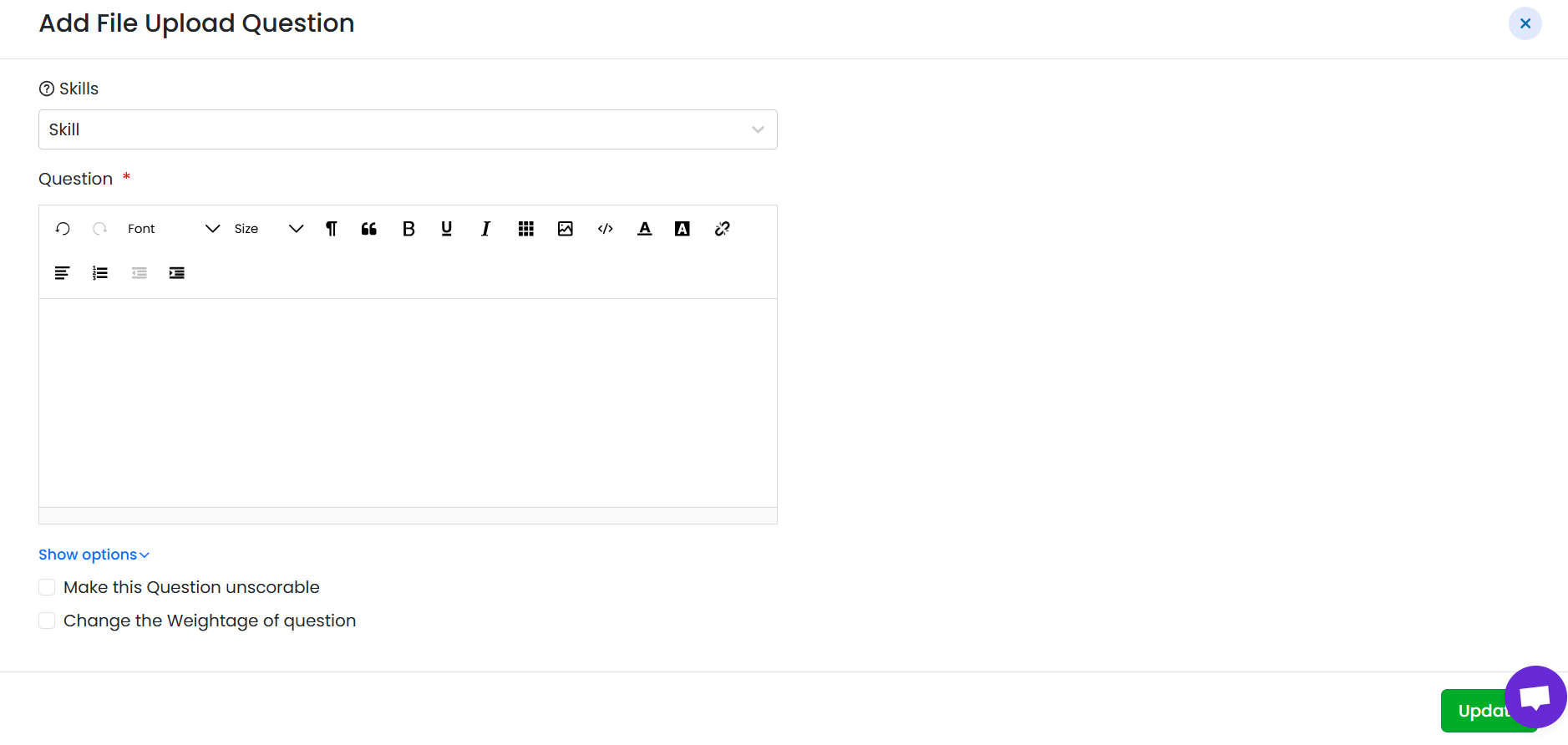 - Enter the question description explaining what the candidate needs to upload.