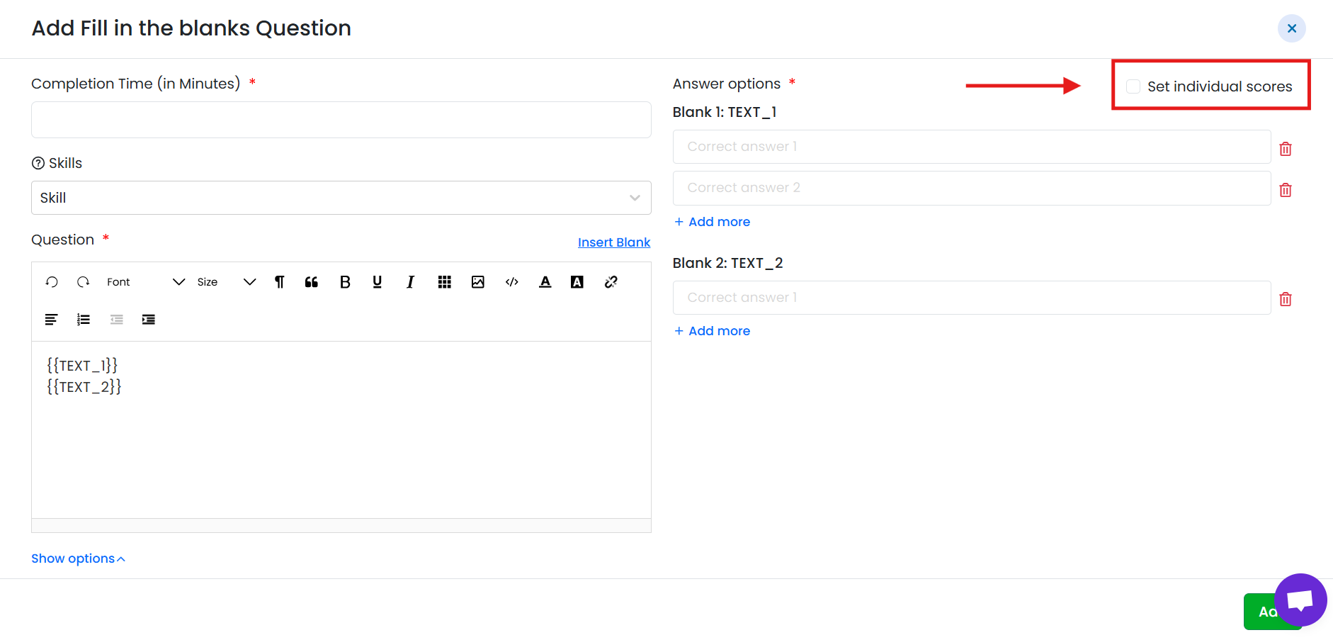 - If the candidate’s answer matches any of the correct answers, the blank is marked correct.