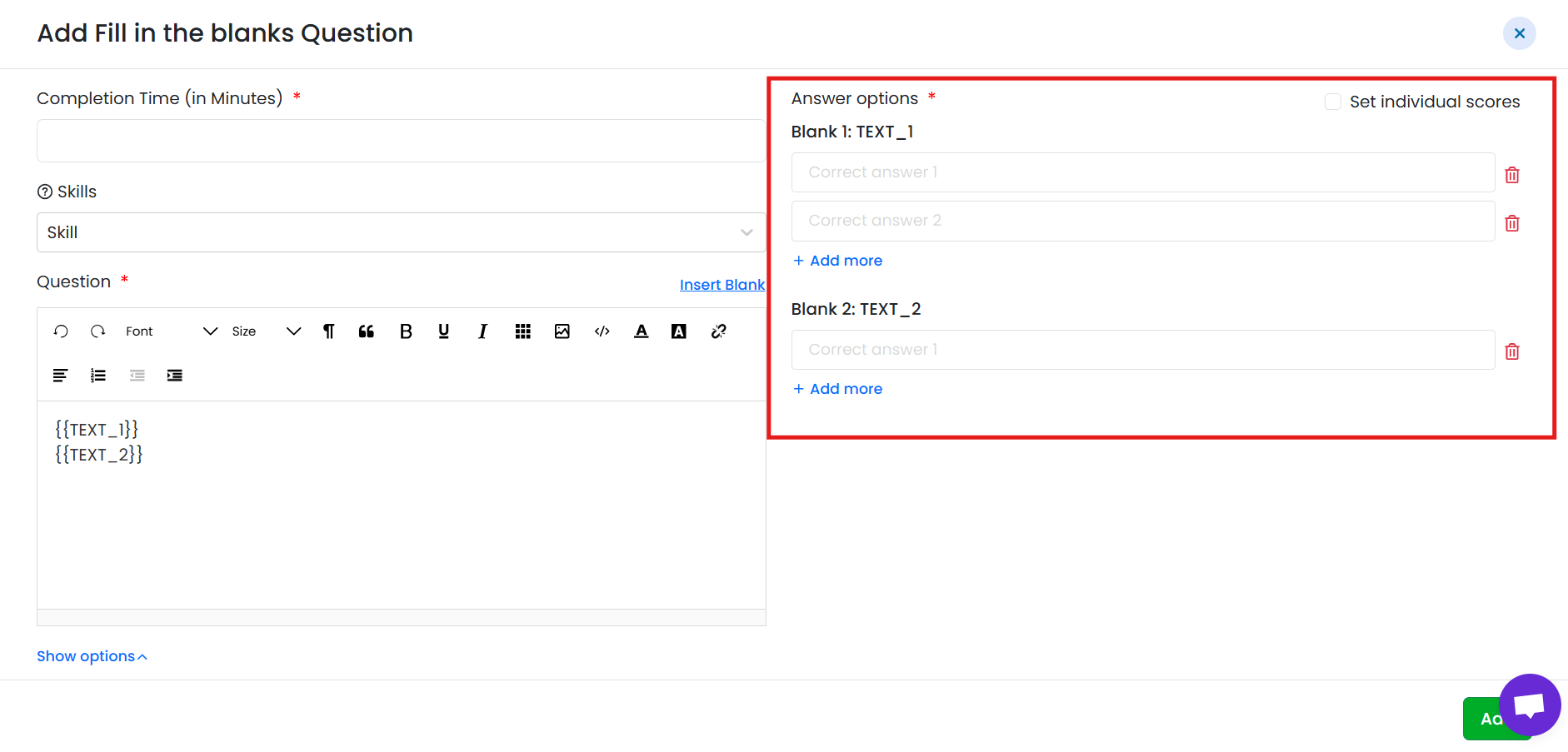 - You can add multiple correct answers for a single blank.