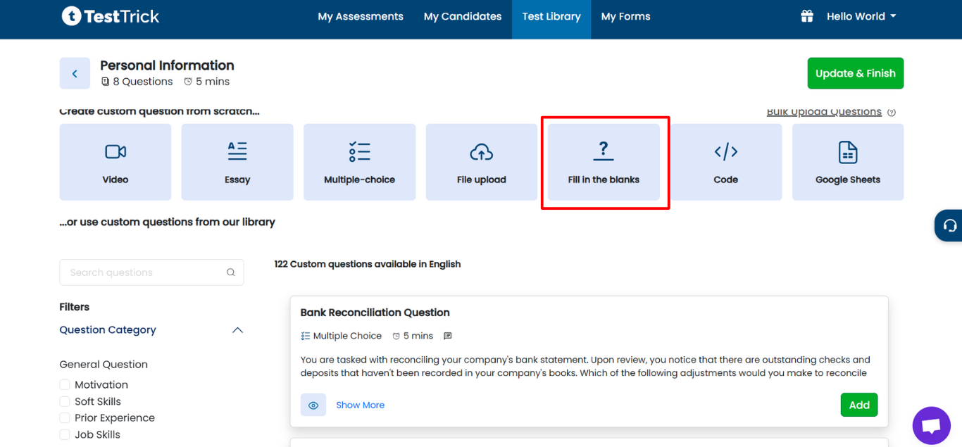 TestTrick allows you to add Fill in the Blank questions to evaluate a candidate’s accuracy, conceptual understanding, and attention to detail. You can create multiple blanks within a single question and define multiple correct answers for each blank.