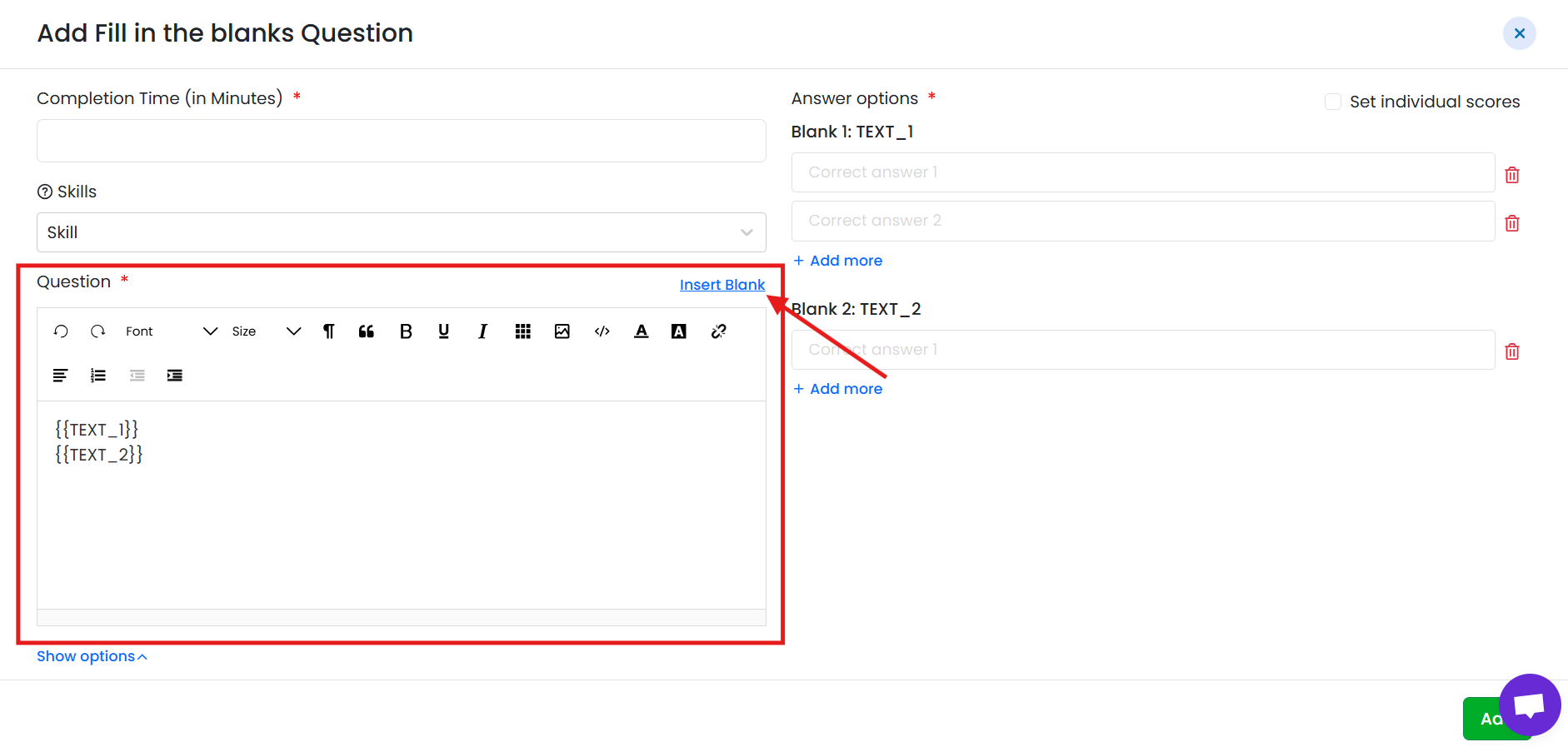 - You can insert multiple blanks within the same question.