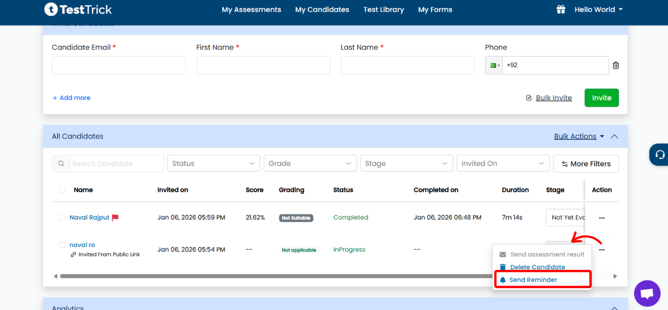 To send reminder emails to candidates in TestTrick, follow these steps: