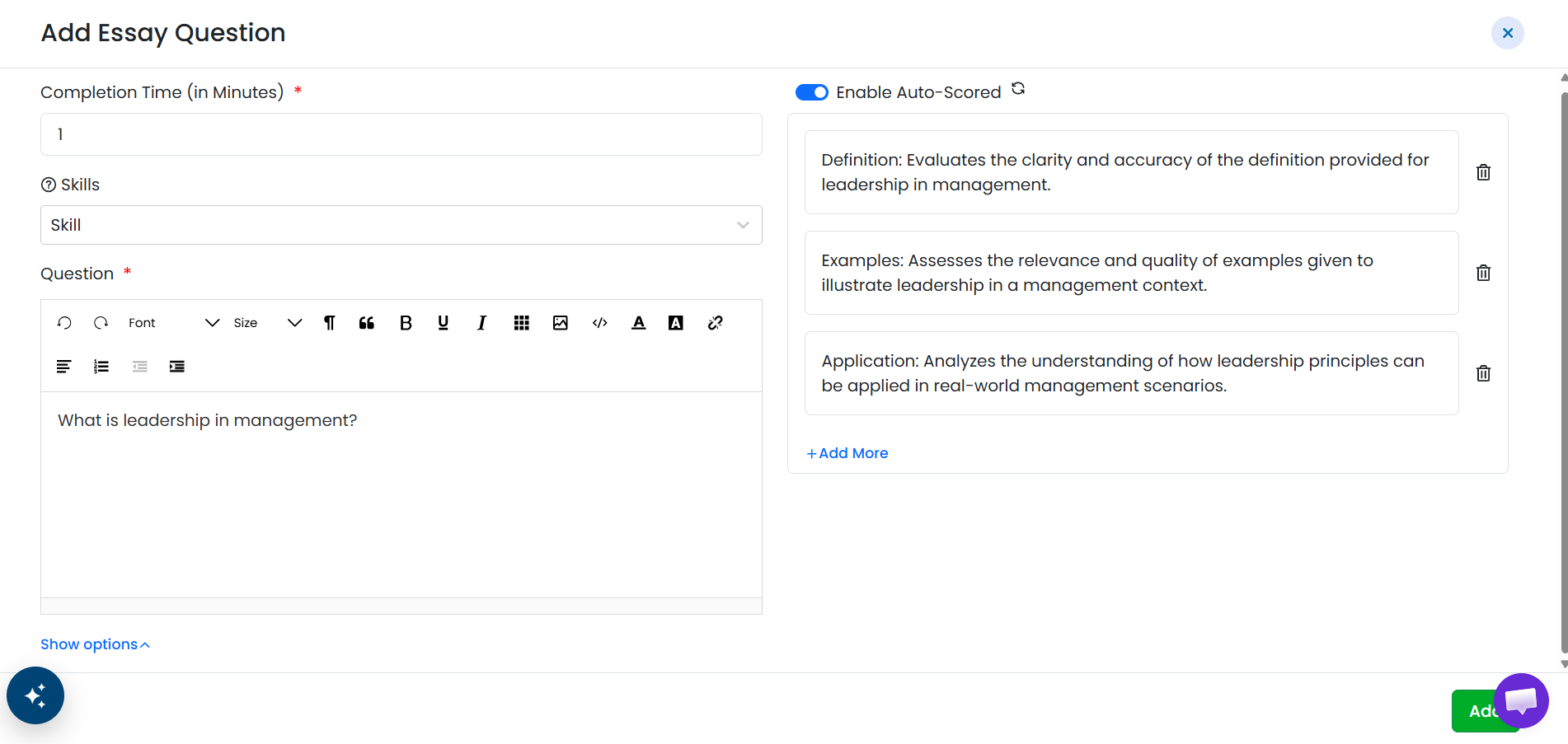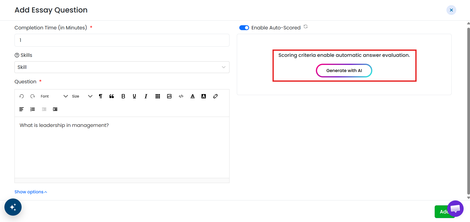 - When a candidate submits an essay or video response, AI automatically evaluates the response using the generated criteria. Scores are assigned based on how well the response meets each criterion.