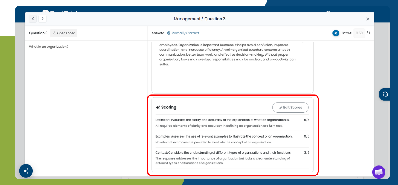 AI Evaluation makes it easy to assess essay and video responses without setting up manual scoring. With AI-generated scoring criteria, your questions are evaluated automatically while still giving you full control over final scores.