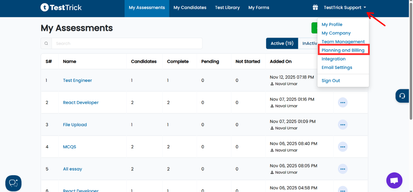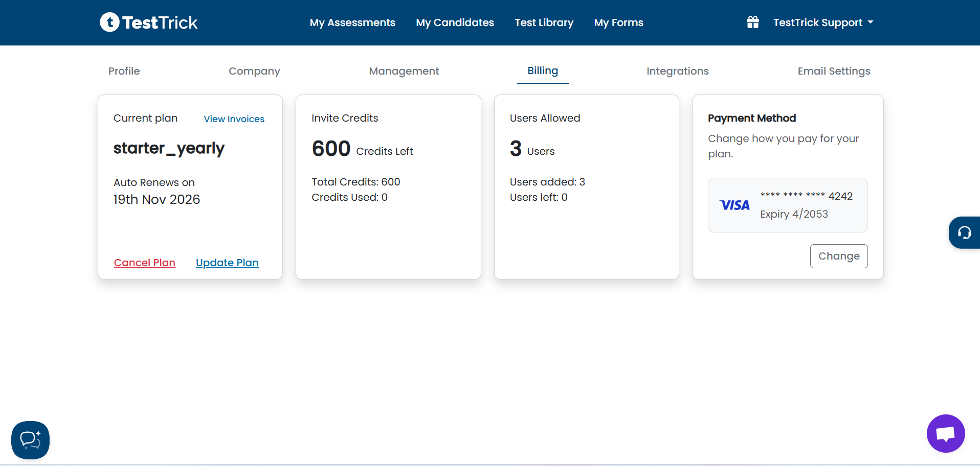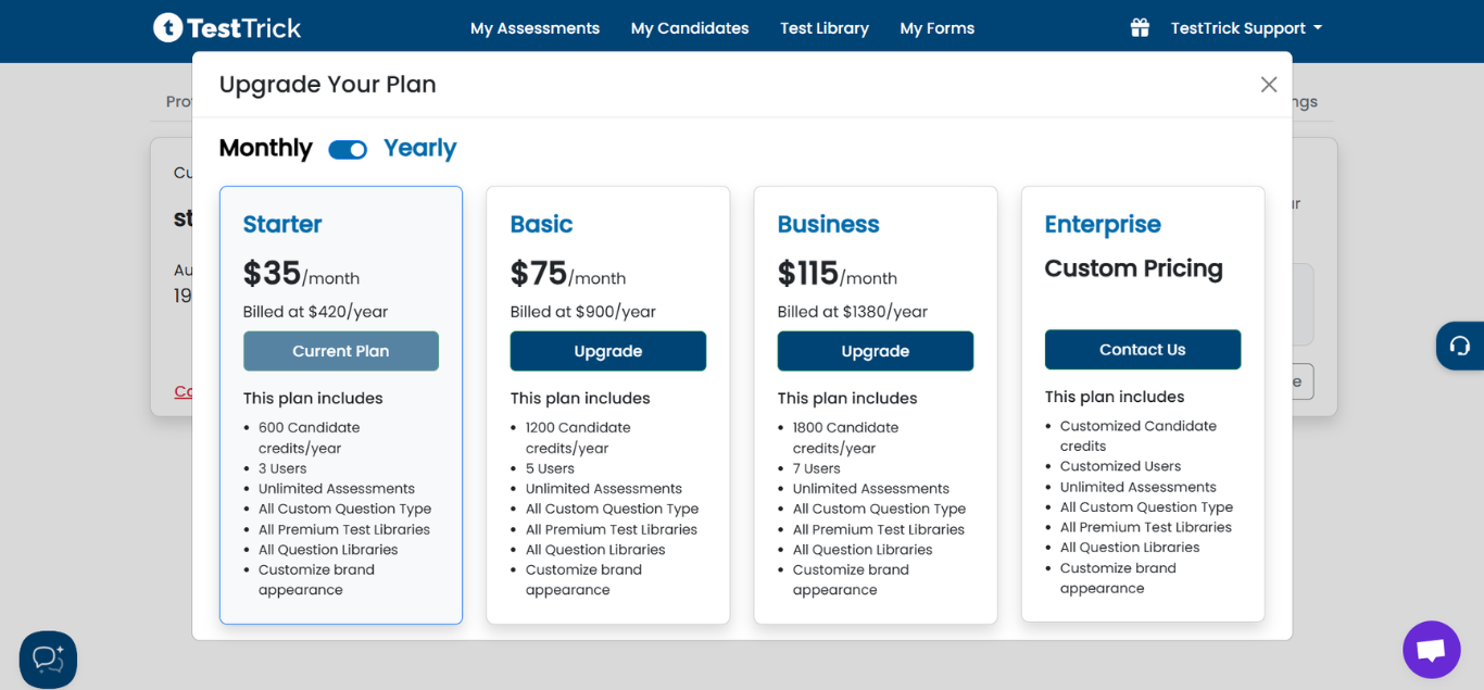 Finding the perfect talent is key to your success. Your Testtrick plan gives you the tools to make that happen. This guide will show you how to view your current plan, explore available options, and upgrade or customize it to match your hiring needs perfectly.